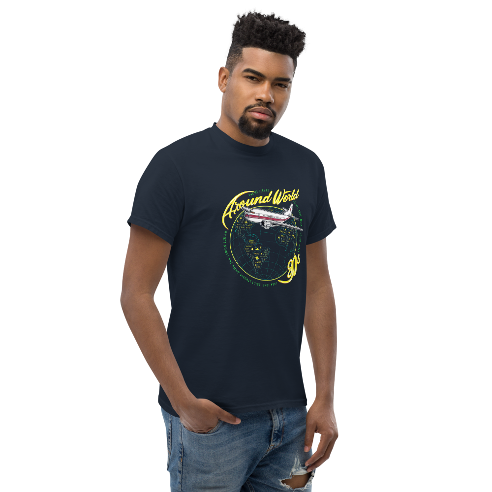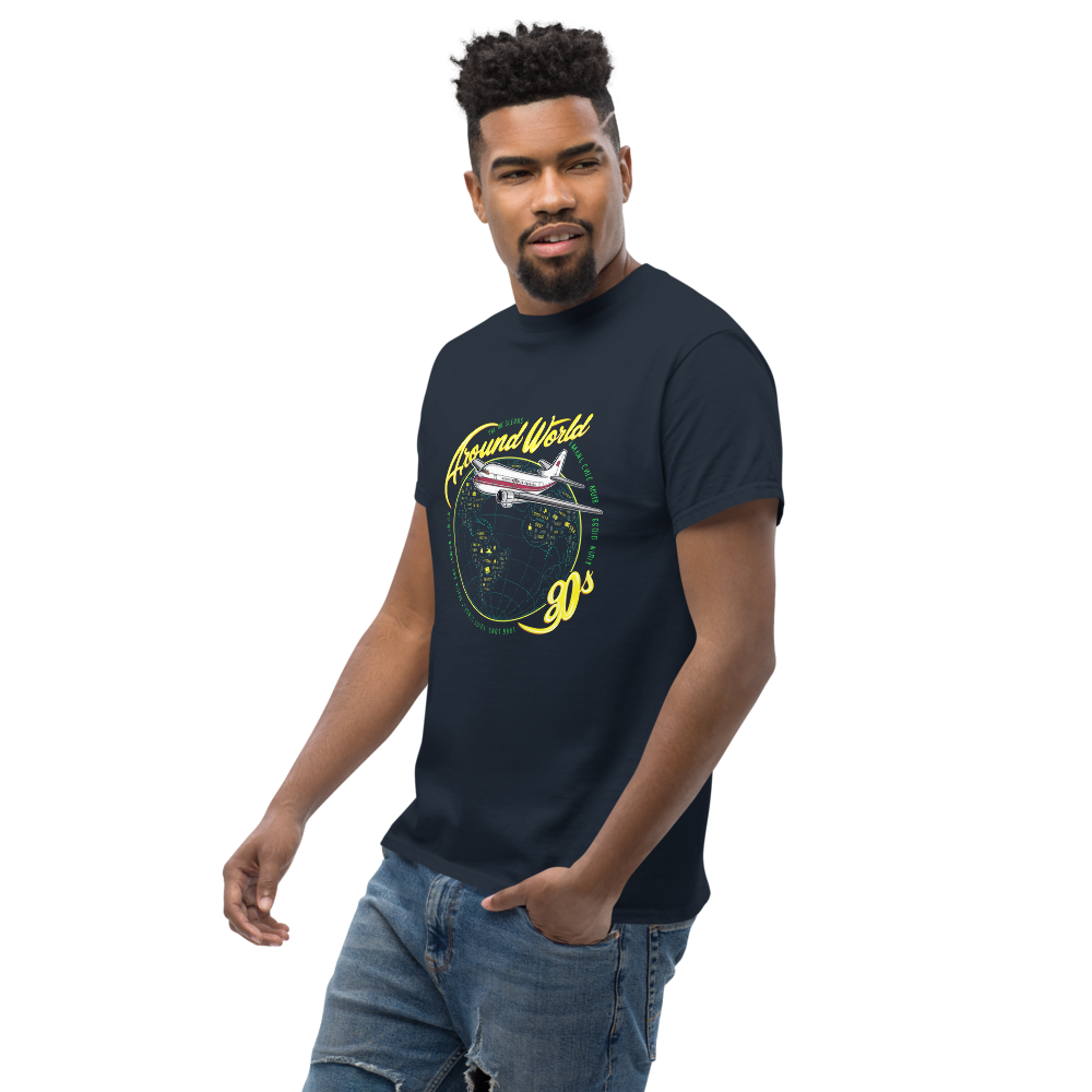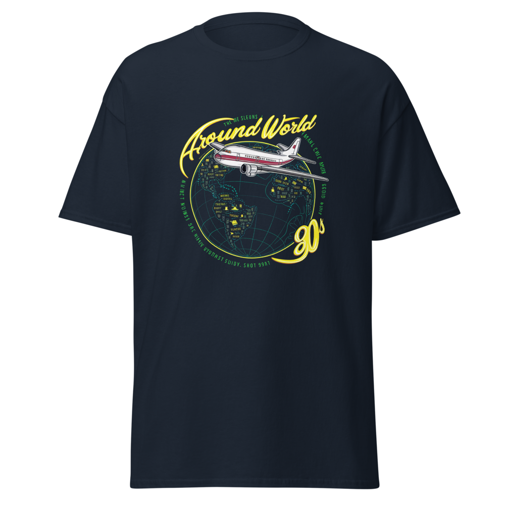 This shirt features a vintage airplane soaring over a globe, with icons of popular 90s travel destinations scattered around. Perfect for travel lovers with a nostalgic touch.