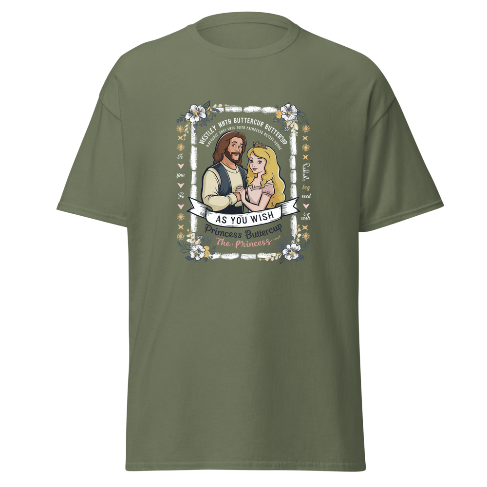 This shirt features a timeless scene of Westley and Princess Buttercup surrounded by a charming "storybook" frame with vintage floral borders. Perfect for fans of classic movies and romance!