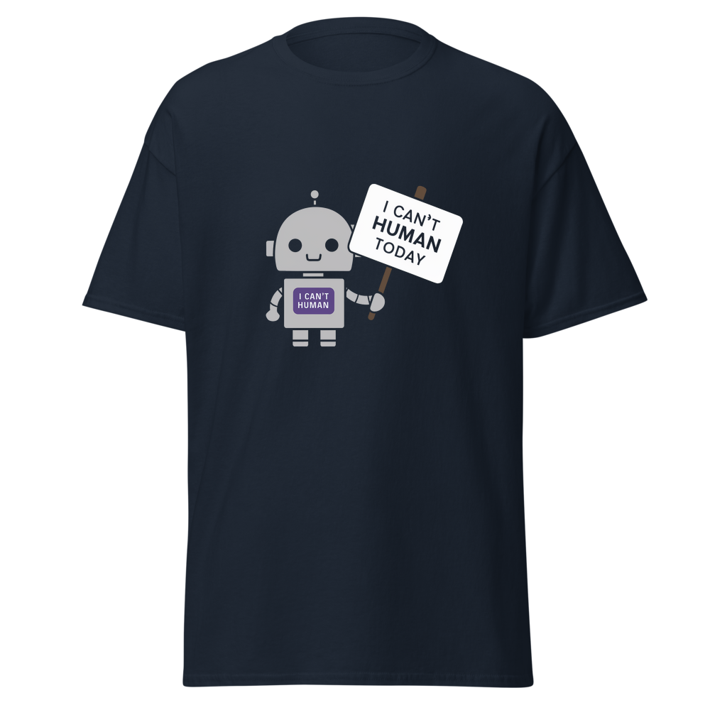 A simple and charming robot cartoon holding a sign, perfect for those days when you just can't deal with being human. Ideal for young adults and anyone needing a playful break from the norm. Unisex and great for vlog followers!