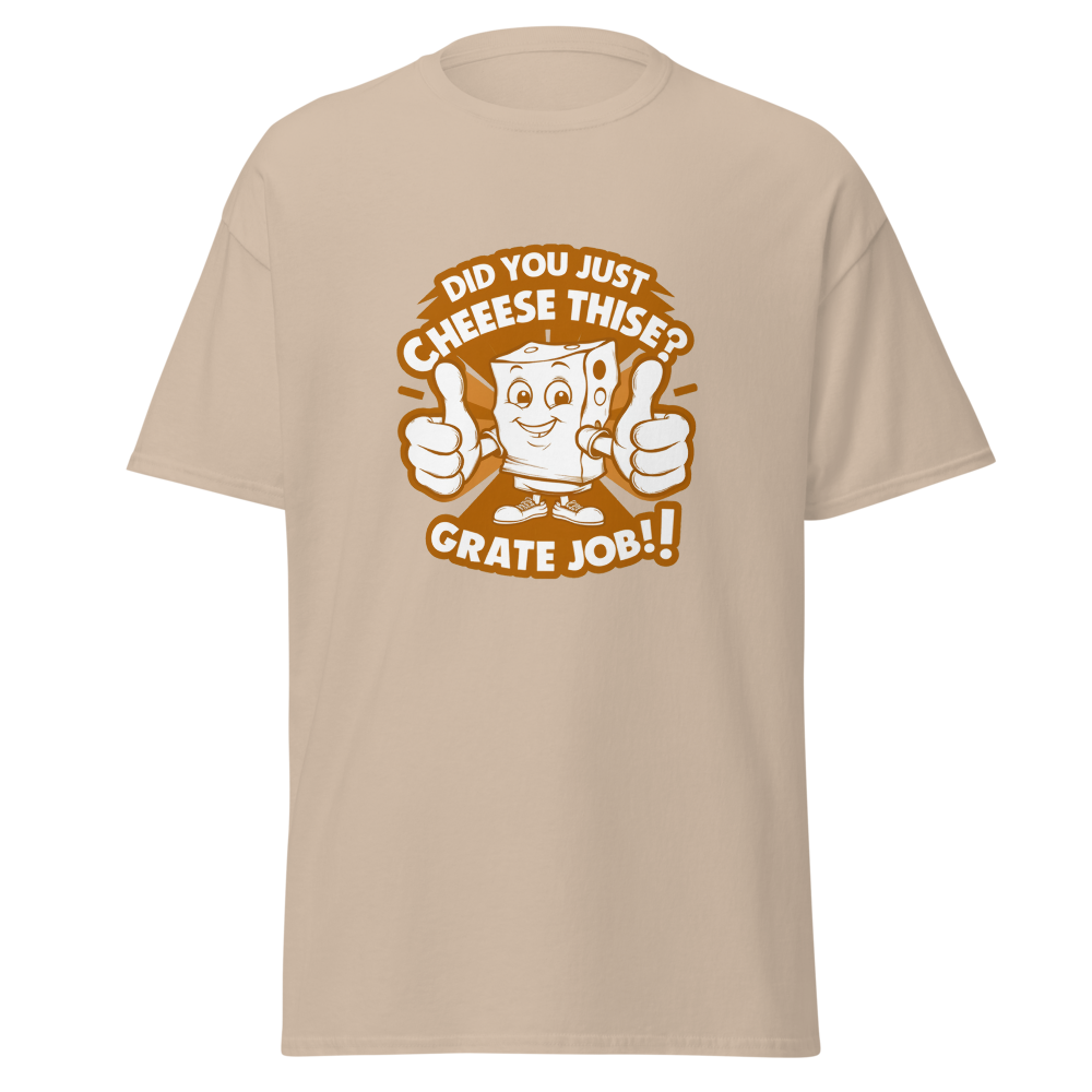 This tee features a cartoon block of cheese giving an enthusiastic thumbs up, adding a fun and quirky touch for anyone who loves a good laugh. Ideal for young adults and stand-up comedy fans.