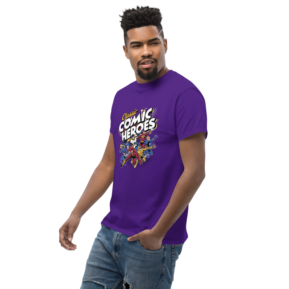 Featuring a throwback design with iconic 90s comic book heroes in action, this tee offers a bold retro vibe. The dynamic background and distressed look make it a must-have for any comic book fan.