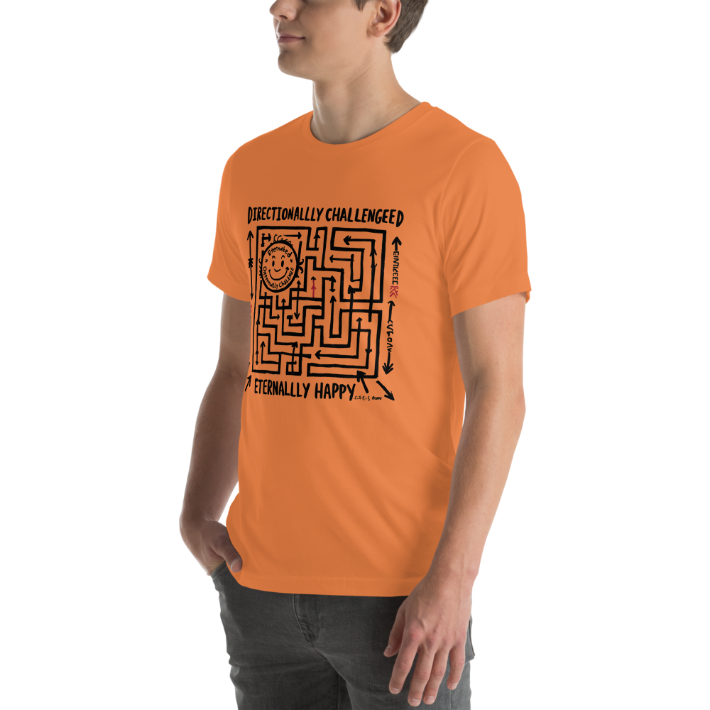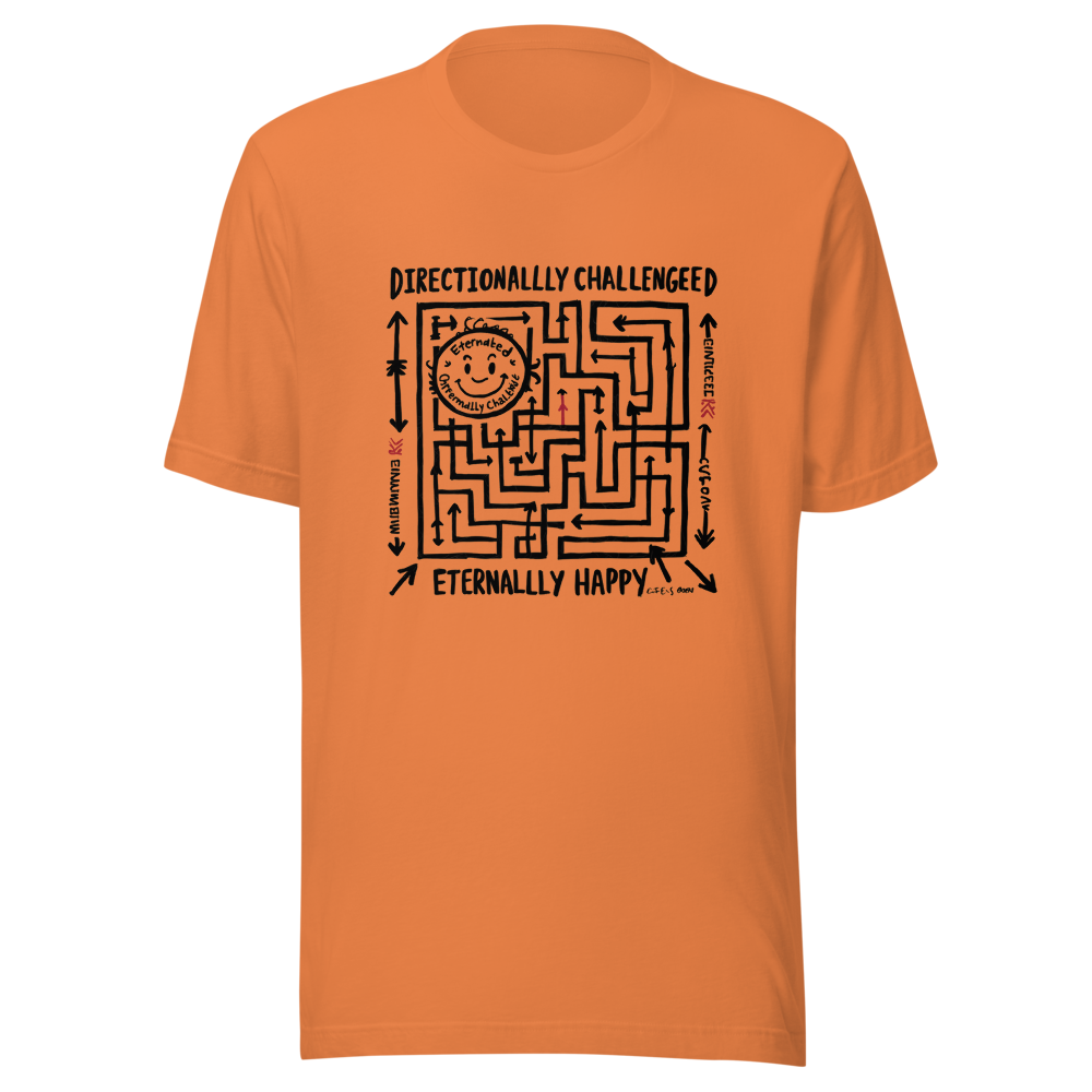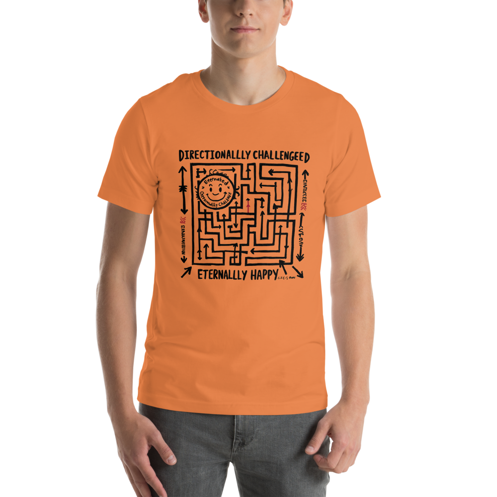 This playful t-shirt features a cheerful cartoon labyrinth exuding happiness, surrounded by arrows pointing every which way. Perfect for travel lovers and those who embrace the journey, no matter where it leads.