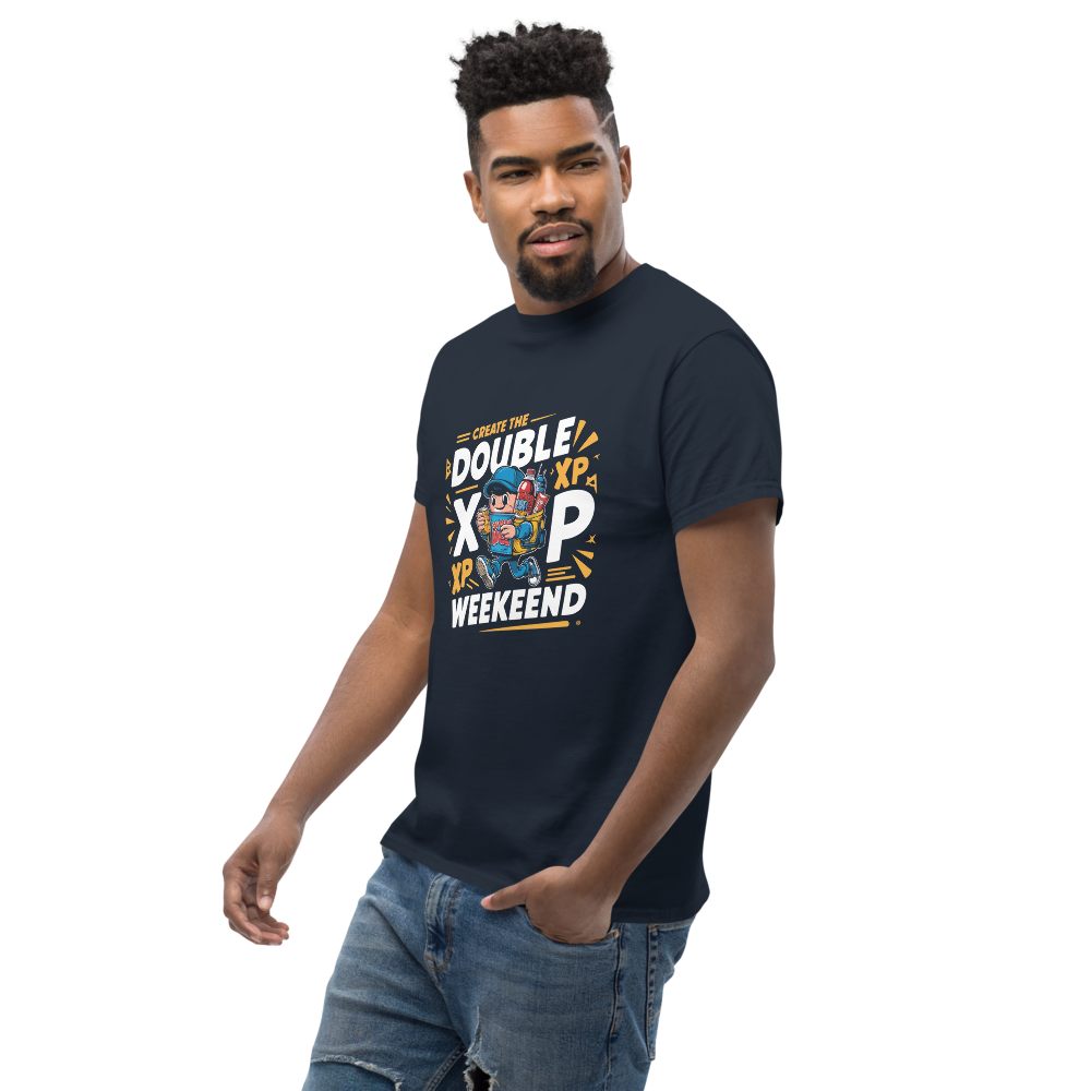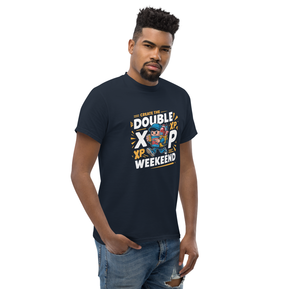 This t-shirt features a fun and energized character all geared up with energy drinks and snacks, perfect for any double XP weekend. Ideal for teens and video gamers who love to show off their gaming spirit.