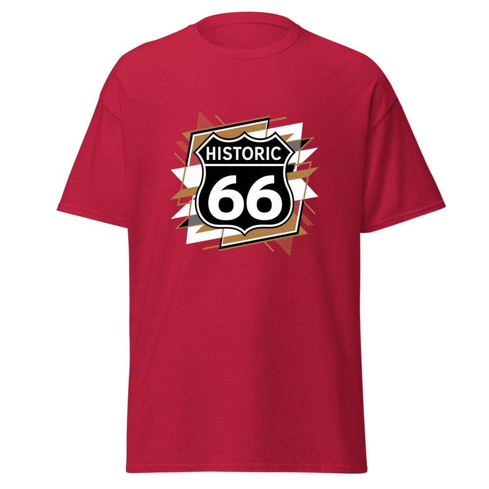 Embrace the spirit of adventure with our stylish Route 66 t-shirt, featuring a classic highway sign set against a trendy abstract geometric background. Perfect for travel enthusiasts and those who love historic routes, this shirt adds a touch of wanderlust to any wardrobe.