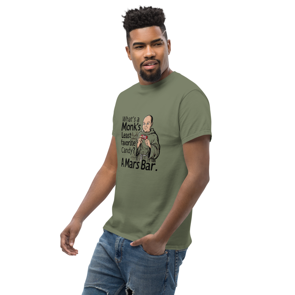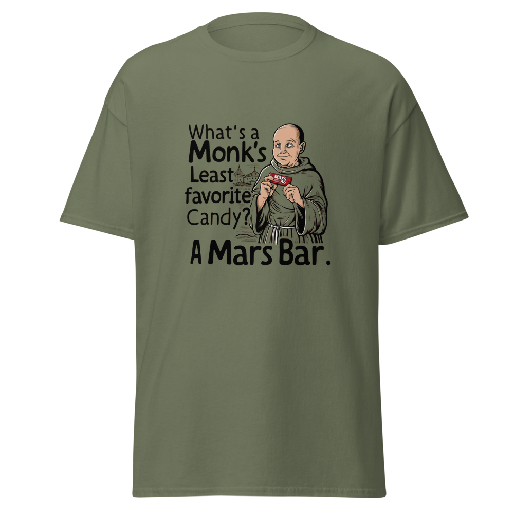 This shirt features a playful design of a monk holding a Mars bar with a monastery in the background, perfect for history buffs who appreciate a good dad joke. A fun and clever addition to any wardrobe.