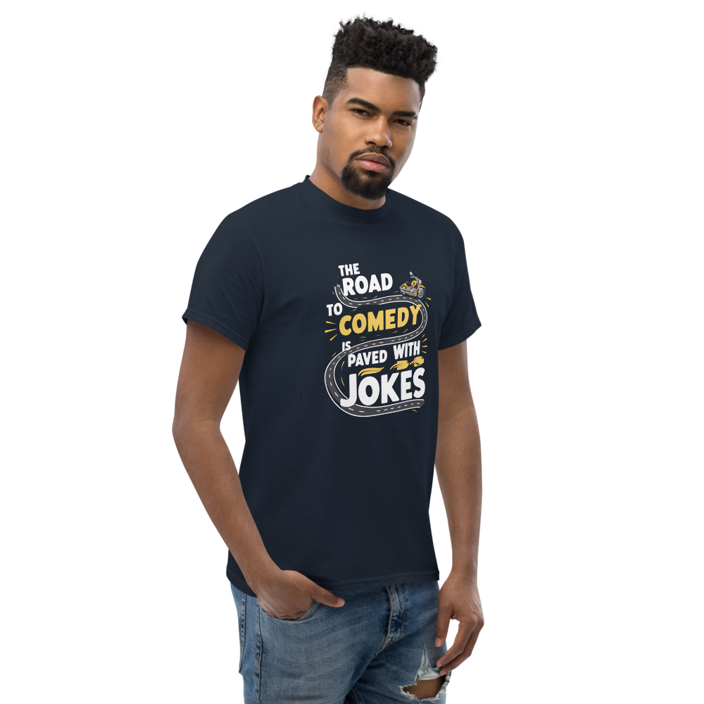 This shirt features a fun comic-style illustration of a winding road with a motorcycle cruising along, perfect for anyone who loves a good laugh and the open road. Ideal for adult male motorcycle enthusiasts who appreciate a touch of humor.