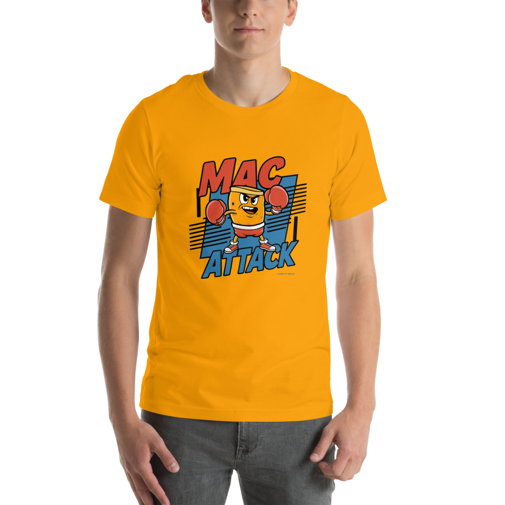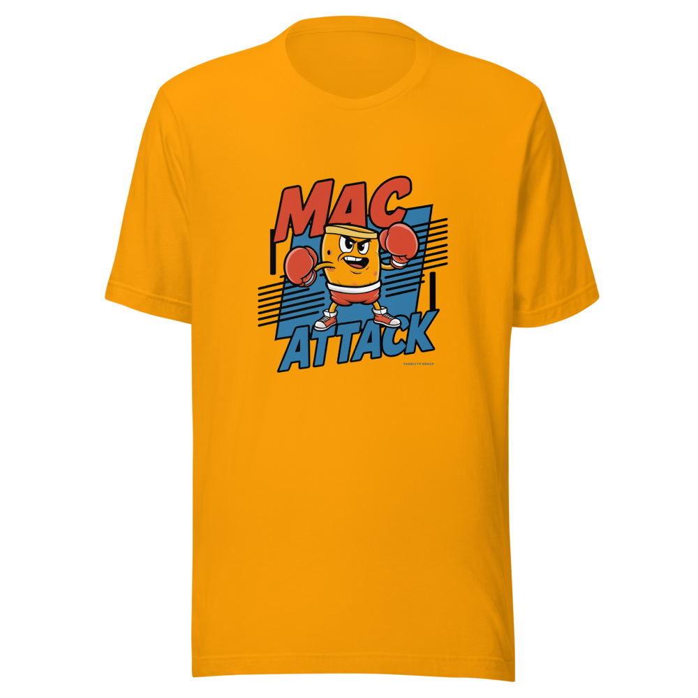 Get ready for a knockout punch of fun with our "Mac Attack" t-shirt! Featuring a cartoon macaroni character sporting boxing gloves and a determined expression, this design captures a playful 90s action pose. Perfect for foodies, chefs, or anyone who loves a good laugh.