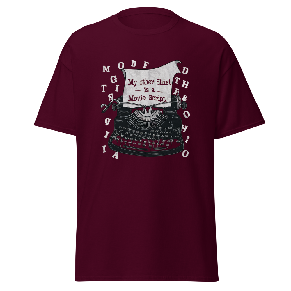 This t-shirt features a vintage typewriter with paper coming out, creating a unique and artistic vibe. Small typewriter letters are playfully scattered around, making it perfect for movie buffs and creative minds alike.