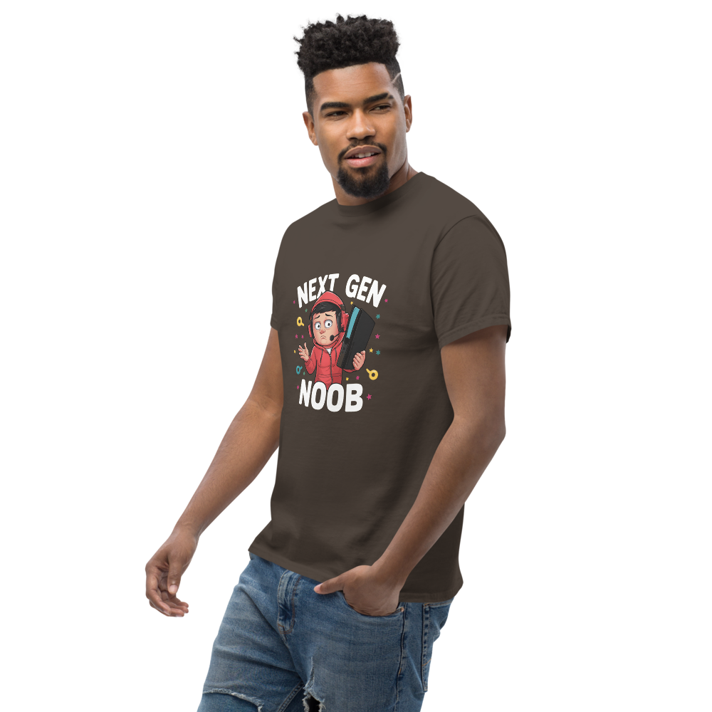This t-shirt features a noob character holding the latest gaming console with a puzzled look, perfect for teens and gamers who love a bit of humor.