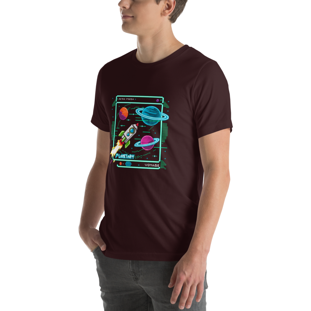 Embark on a cosmic journey with this retro-inspired pixel art rocket, set against the backdrop of various colorful planets. Perfect for astronomy enthusiasts, this design brings a nostalgic video game feel to your wardrobe.