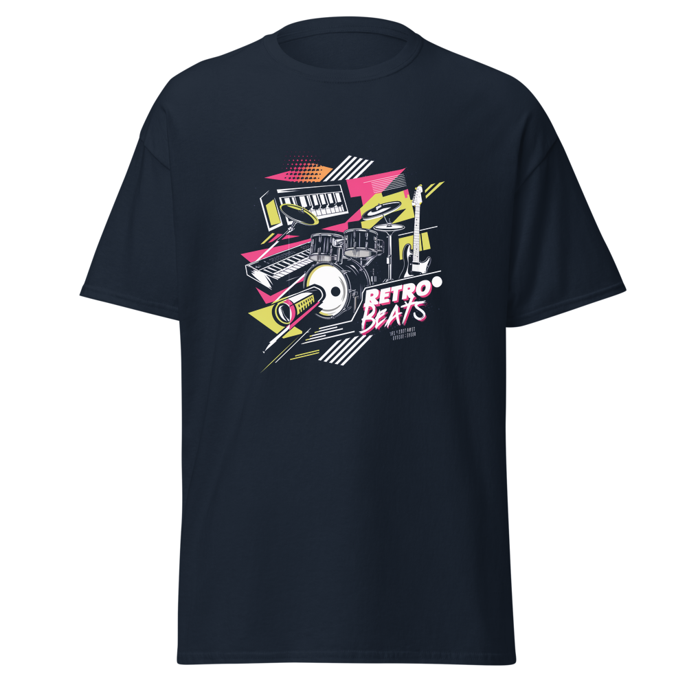 This t-shirt features an abstract rendering of classic 80s musical instruments mixed with bold geometric patterns. The design has a modern pop art flair that's perfect for anyone who loves '80s/'90s pop culture. Great for young adults, especially guys who appreciate a nostalgic vibe with a contemporary twist.