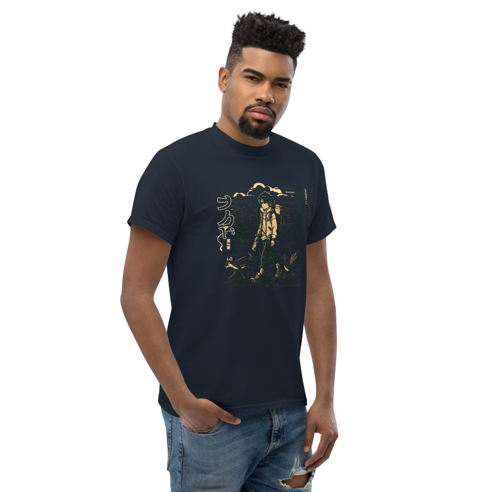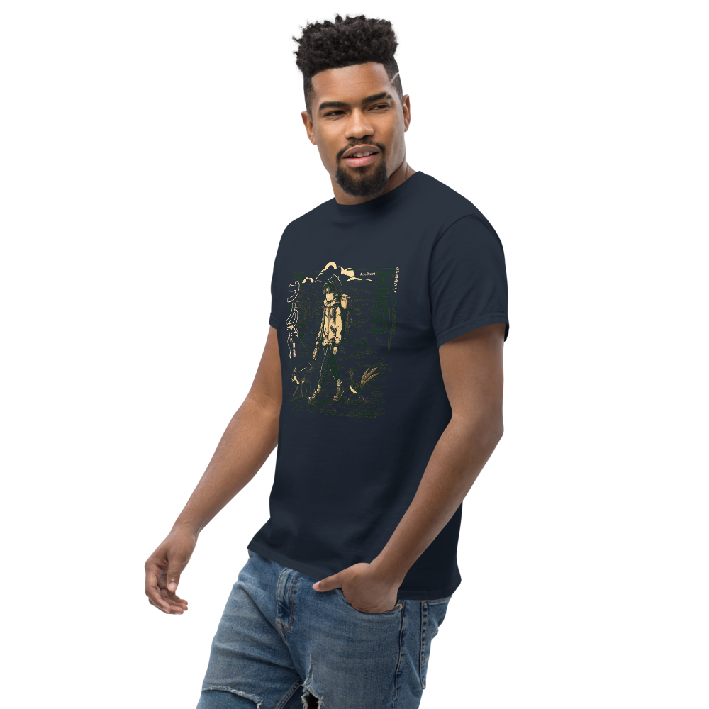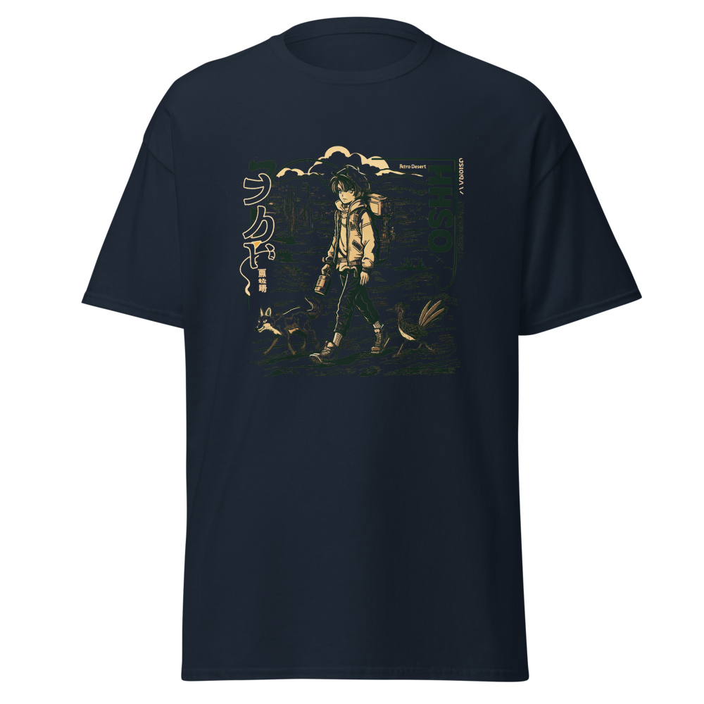 Dive back into the '90s with this retro-inspired design featuring a cool anime character traversing a vast desert landscape. Perfect for anime and manga fans, this shirt blends classic vibes with a modern twist, making it a must-have for your collection.