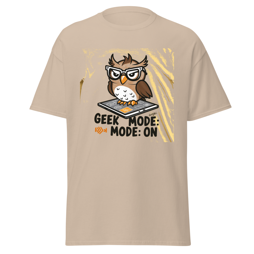 This shirt features a cool cartoon owl wearing glasses and intently reading a tablet, surrounded by fun tech symbols. Perfect for anyone who's proud to flaunt their geeky side!