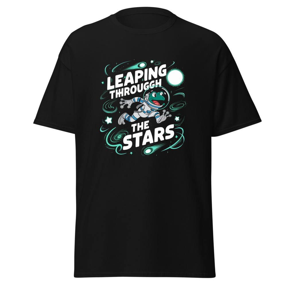A playful cartoon frog in a space suit exploring a fun, abstract space scene. Perfect for teens and sci-fi fans alike!