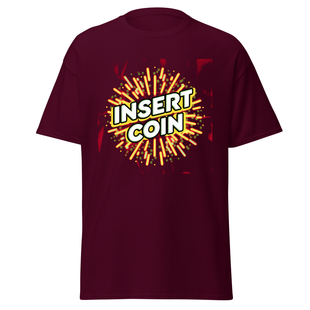 This t-shirt features a cool retro "Insert Coin" design, complete with arcade-style borders and fun abstract patterns. Perfect for kids and fans of classic gaming!