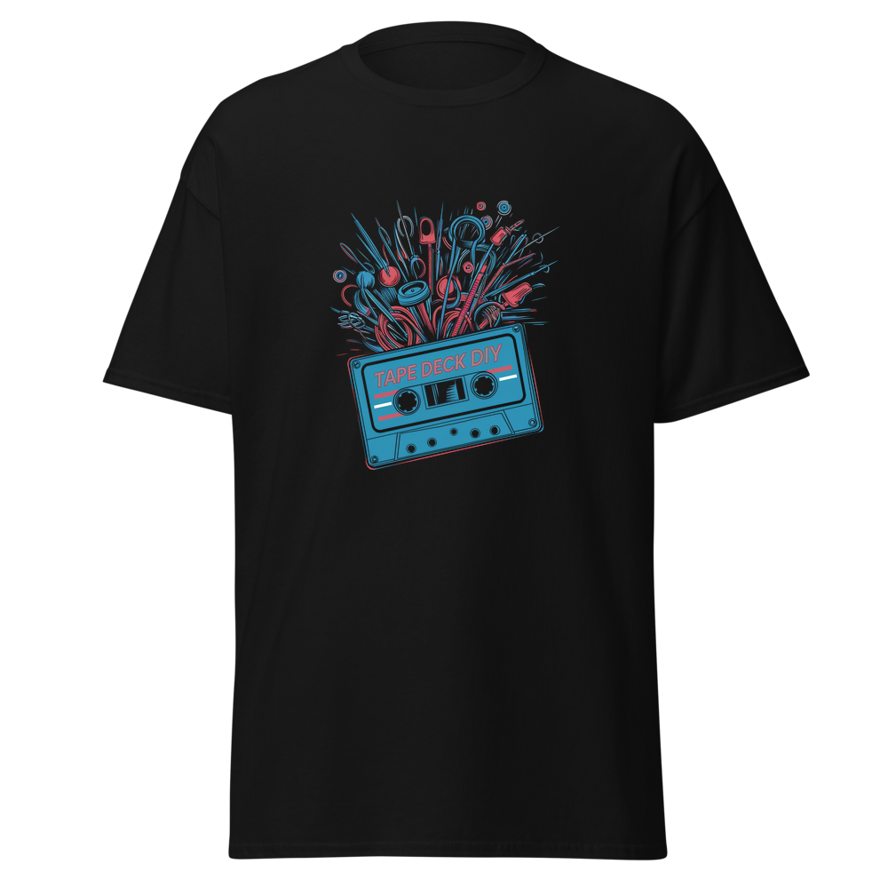 This creative t-shirt design features a retro cassette tape with fun crafting elements like buttons, needles, and threads spilling out. Perfect for the DIY enthusiasts who love a mix of nostalgia and creativity.