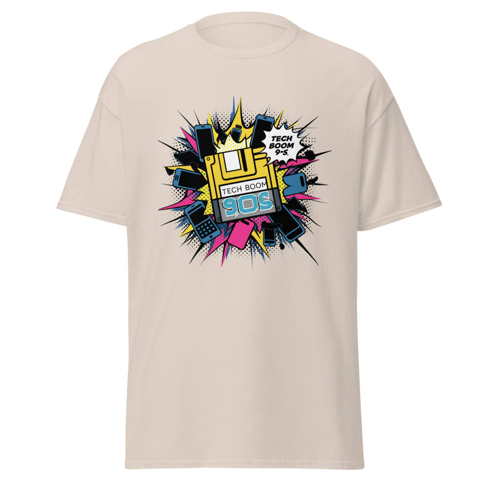 Dive into nostalgia with our Tech Explosion t-shirt, featuring bold, abstract patterns and iconic 90s tech gadgets like floppy disks and early cell phones in a vibrant pop art style. Perfect for adults who love a touch of retro flair.