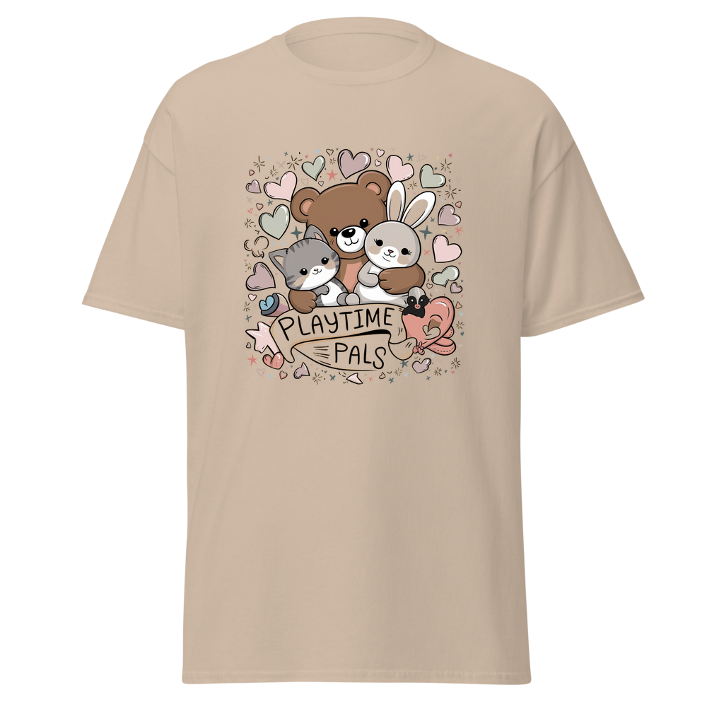 Embrace the charm of childhood with this adorable design featuring a cuddly teddy bear hugging a sweet bunny and an endearing kitten. Surrounded by hearts, sparkles, and playful patterns, this shirt is perfect for kids who love their furry friends.