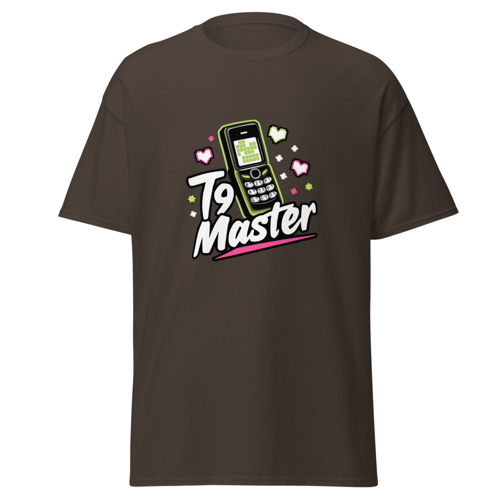 This shirt features a nostalgic design with an old flip phone, surrounded by text message icons, pixel hearts, and stars. Perfect for those who love retro vibes and a bit of tech history.