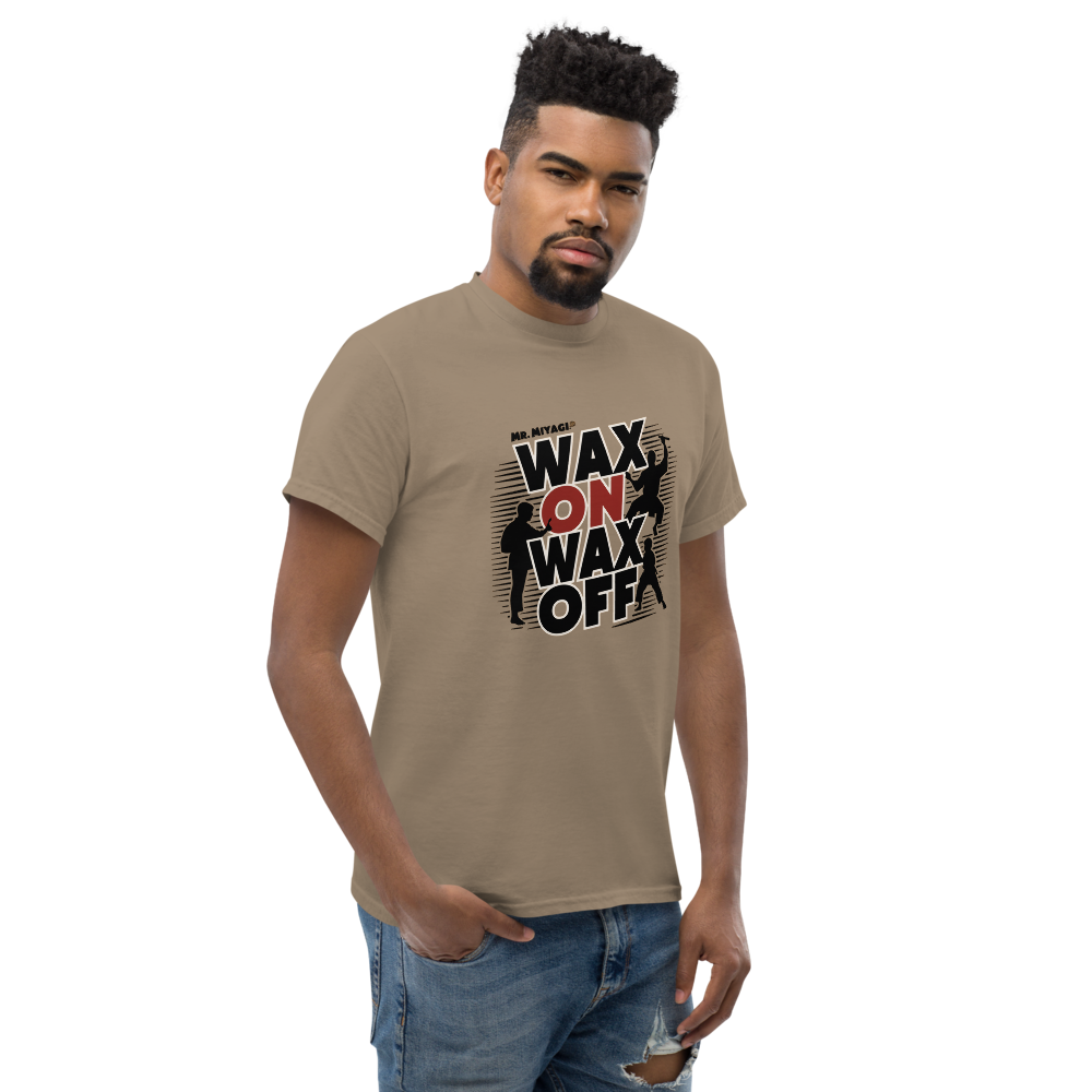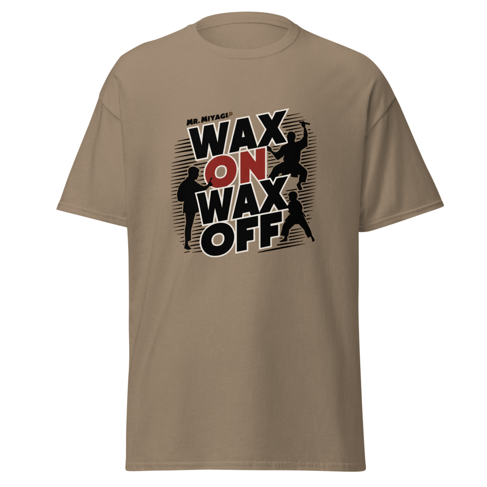 A striking silhouette of Mr. Miyagi teaching the classic waxing motion, with the Karate Kid practicing in the background. A must-have for fans of classic movies, perfect for young adults and women who love nostalgic throwbacks.