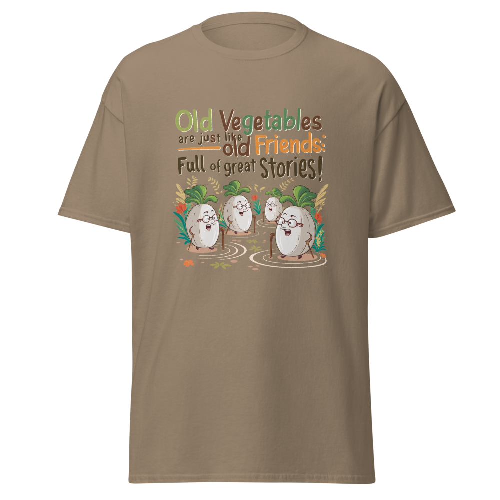 This playful t-shirt features charming cartoon elderly vegetables, complete with canes and glasses, enjoying a chat. With a backdrop of subtle garden paths and plants, it’s perfect for seniors, gardeners, and anyone who loves a good story.