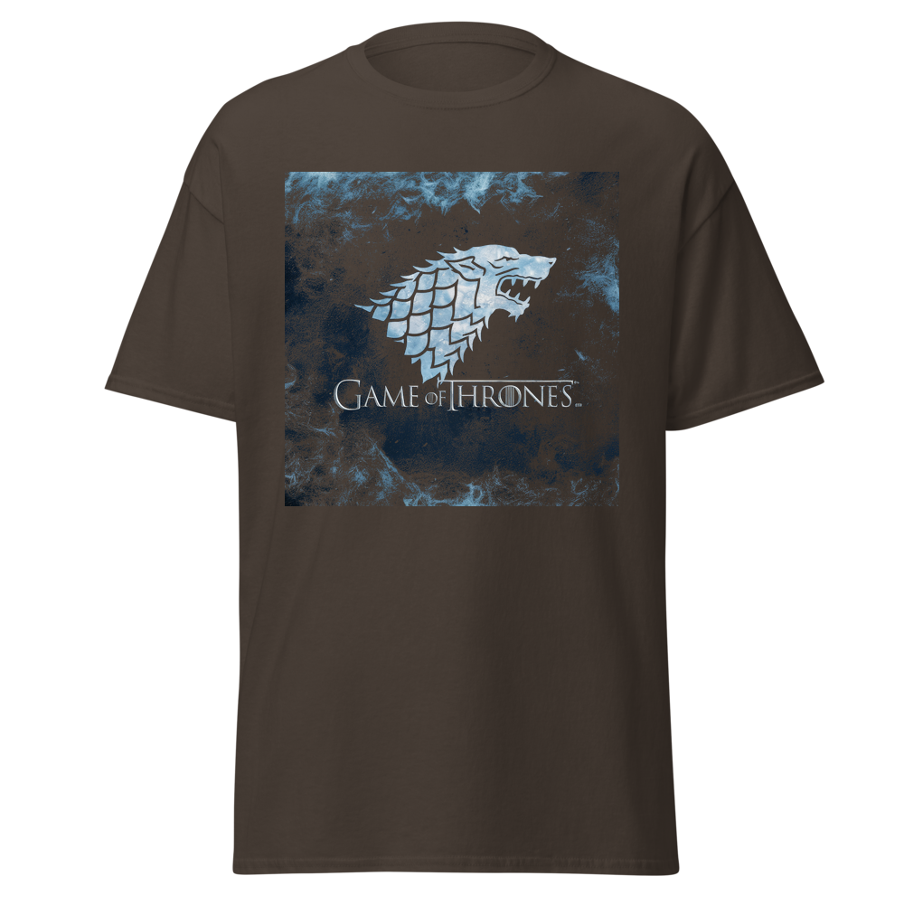 Embrace the chill and express your love for the epic series with this striking design. Featuring a silhouette of a mighty direwolf set against a snowy backdrop, this tee is perfect for fans of the unforgettable world of winter and fantasy.